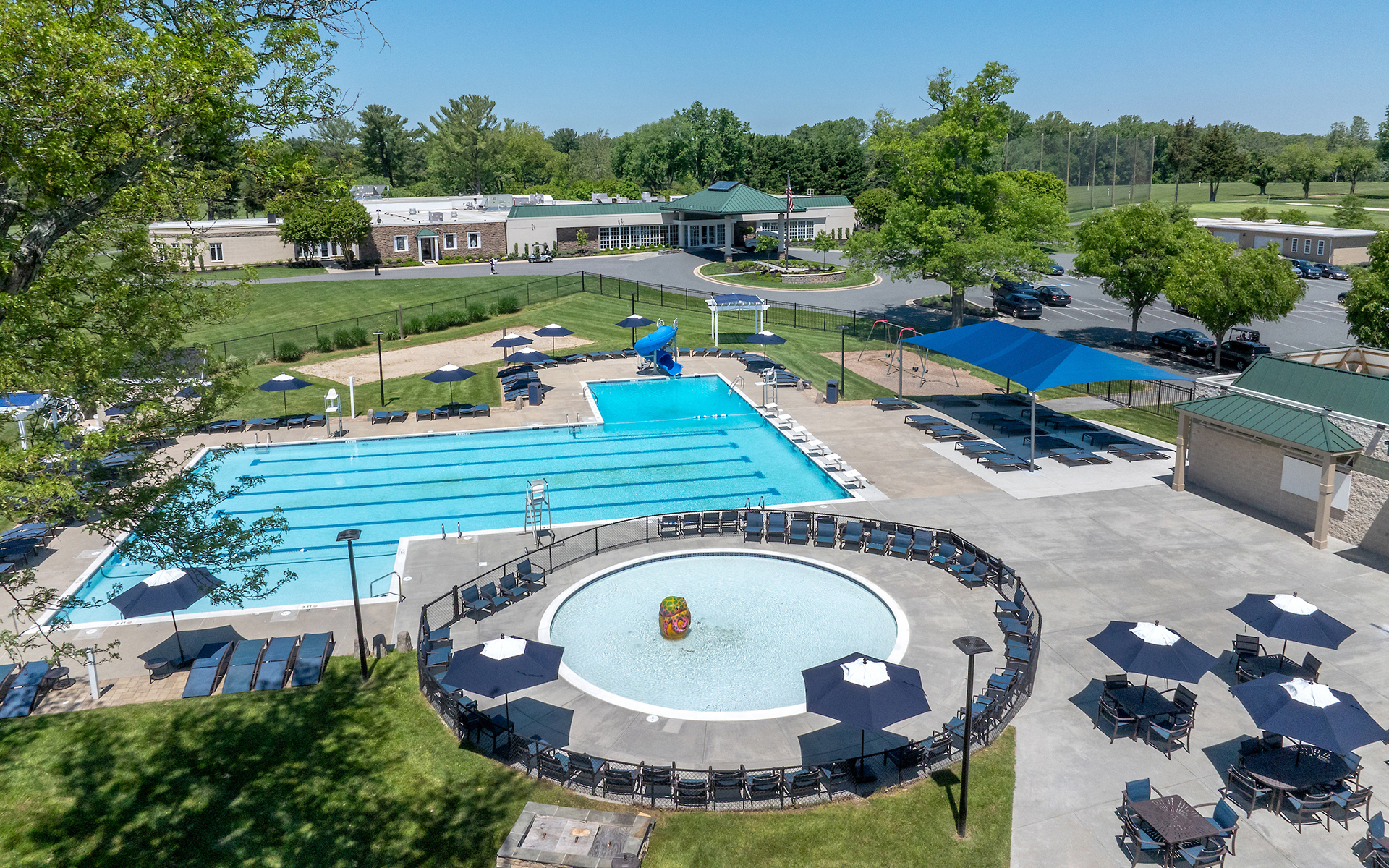 Norbeck’s swimming facilities welcome both family-oriented and competitive swim activities. Professionally staffed aquatic activities offer Members a full range of swimming lessons and a competitive swim team program. Nestled in a picturesque tree-lined grove featuring 75-year-old maple trees and overlooking the golf course, the main pool features lap lanes and an inviting toddler’s area. A separately fenced baby pool is conveniently located adjacent to the main pool.